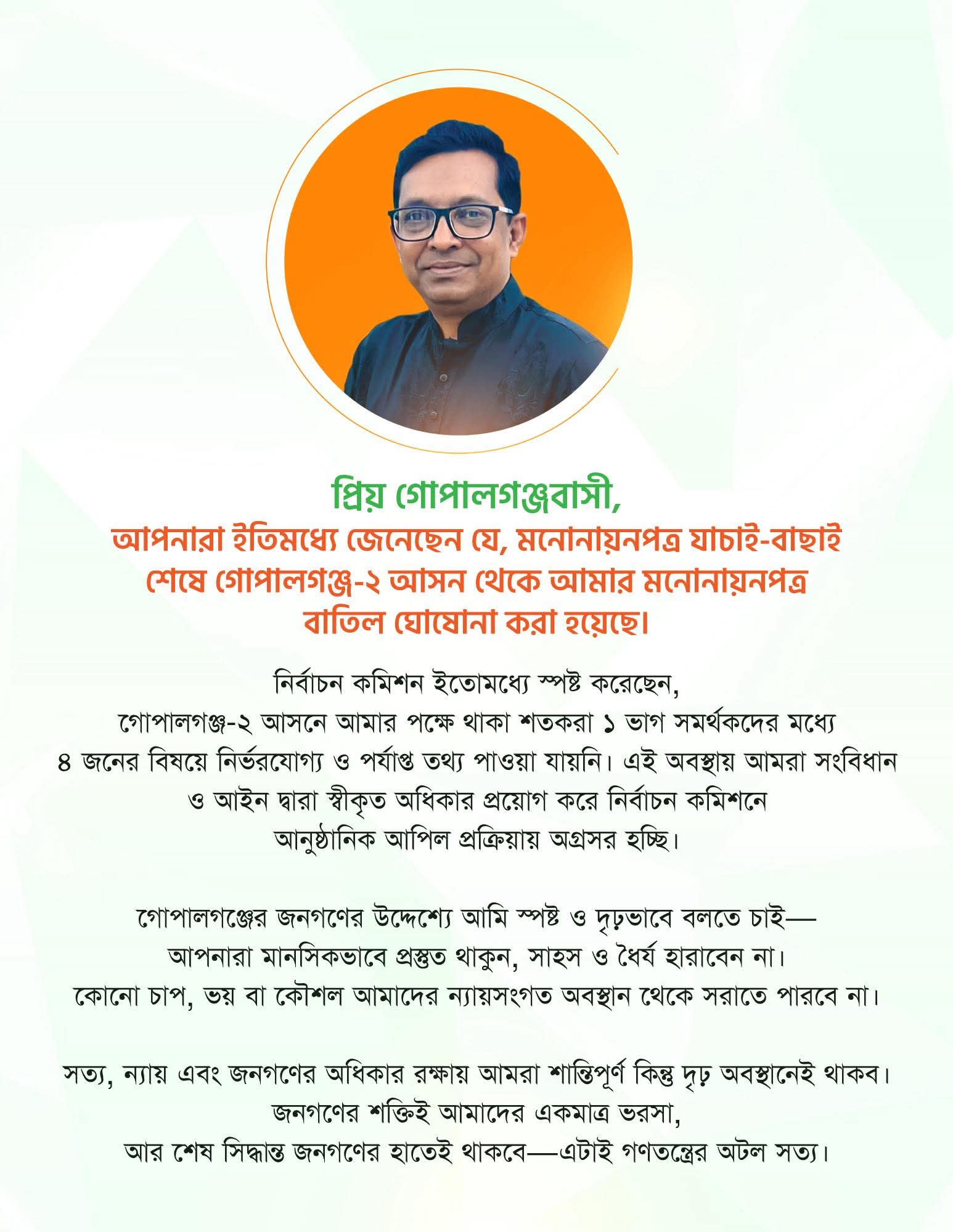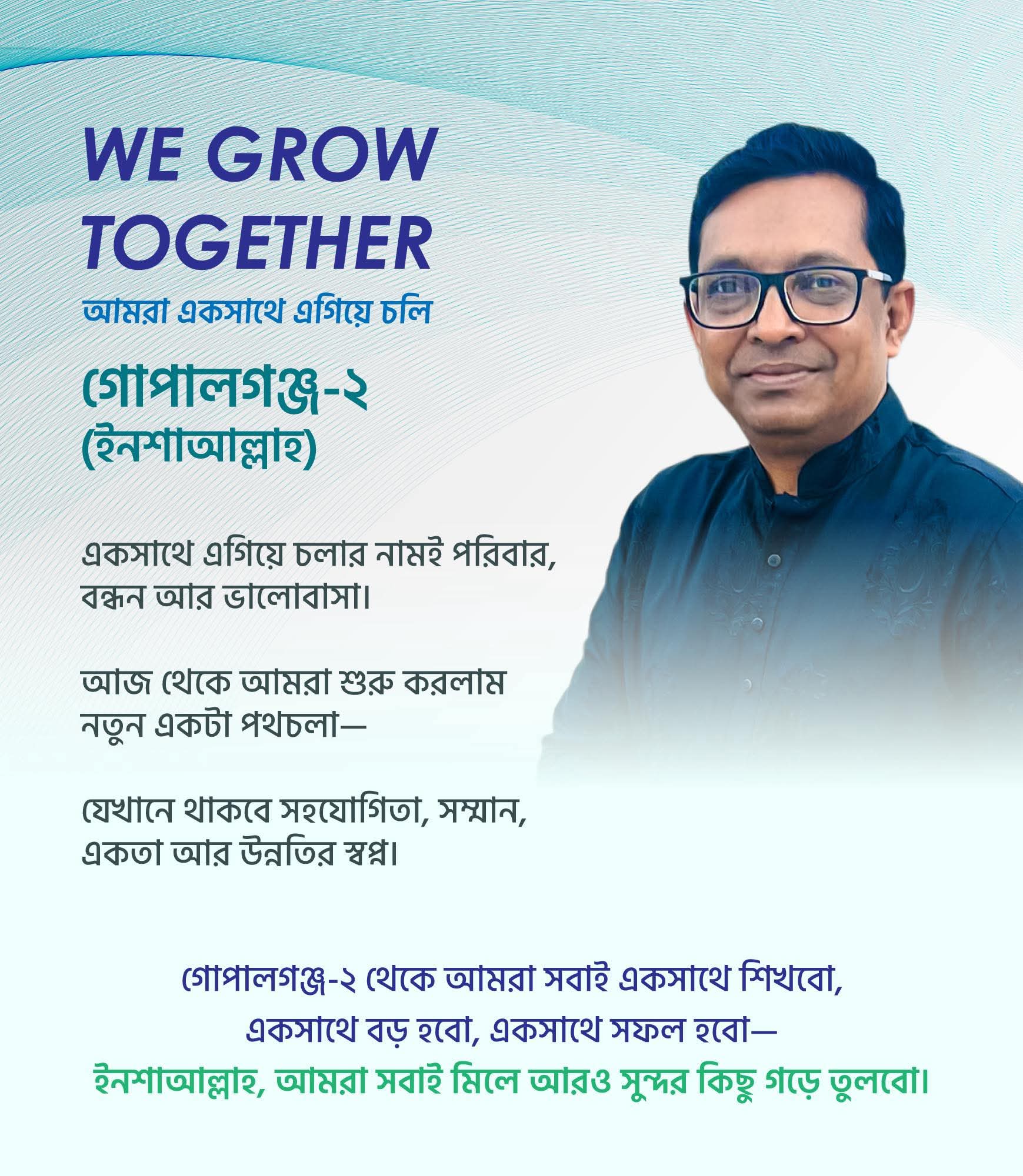 আপনাদের ভালোবাসায় ২০২৪ সালে আমি উপজেলা চেয়ারম্যান হিসেবে নির্বাচিত হয়েছি। এবার গোপালগঞ্জ-২ আসনে স্বতন্ত্র প্রার্থী হিসেবে 'টেলিফোন' মার্কা নিয়ে আপনাদের সামনে হাজির হয়েছি।